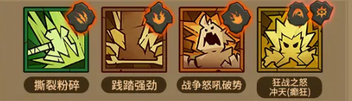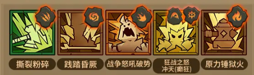 3、技能搭配:撕裂粉碎、践踏强劲、战争怒吼破势、狂战之锅冲天(瘛狂)、原力锤狱火。