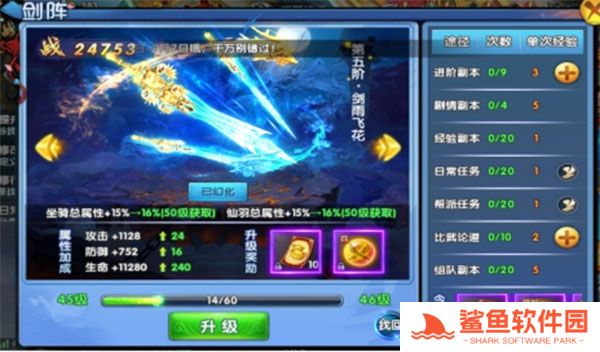随着主线任务和支线任务的完成,玩家会升到53级左右,这个时候继续升级的话就需要完成剑阵中的各种任务哦。其中经验副本、日常任务、帮派任务、护送仙女都会提供大量经验,在每天的15:30-16:00以及18:30-19:00,护送仙女的经验都会翻倍哦,大家一定不要错过。