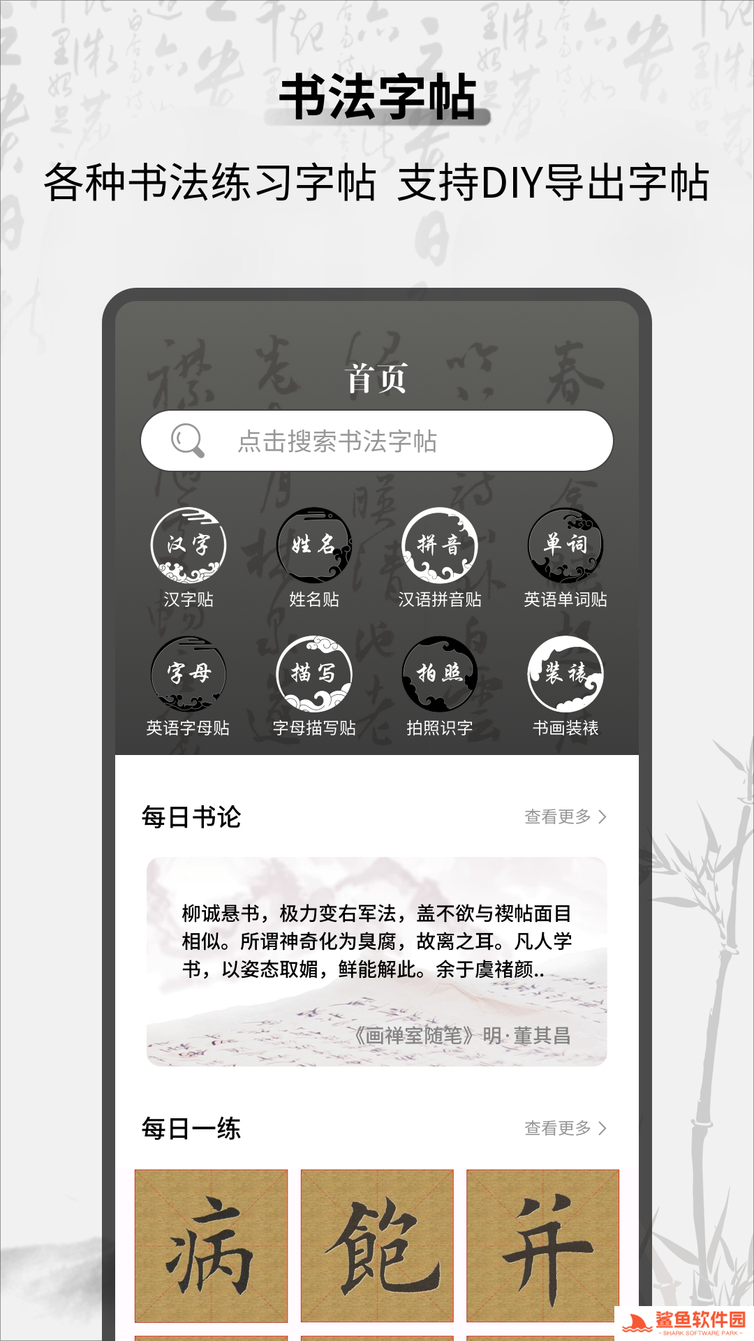 经典字帖:收录了众多经典书法字帖,涵盖历代书法大家的作品,用户可以根据自己的喜好选择练习对象。