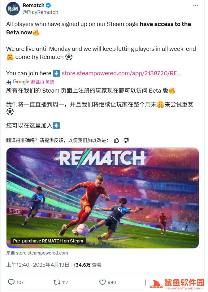 由《师父》开发商Sloclap开发的全新足球游戏《Rematch》在Steam上火了,Steam BETA公测期间,首日同时在线峰值就已超越EA足球游戏《FC 25》在Steam上的最高纪录。《Rem