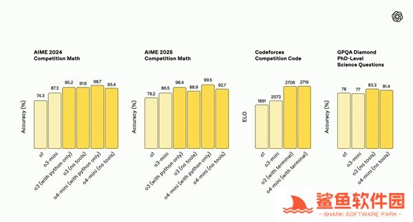 在AIME 2025题目中,两者准确率分别达88.9%和92.7%,在Codeforces编程竞赛评分中,支持终端工具的o3和o4-mini分别取得了2706和2719的ELO分数,领先o1的1891和o3-mini的2073。