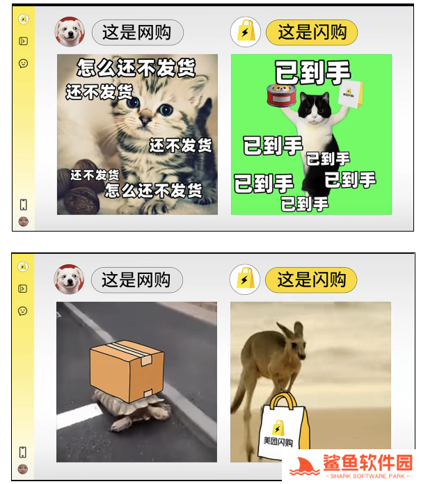 其中有一副画面格外引人注目,图片显示为一只狗,称这是网购,文字配图为“你的东东再等等”。