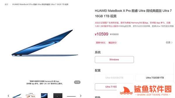 当前华为商城在售的MateBook X Pro定价是10599元起,搭载英特尔酷睿Ultra 7处理器,配备16GB内存和1TB存储,预装Windows 11系统。