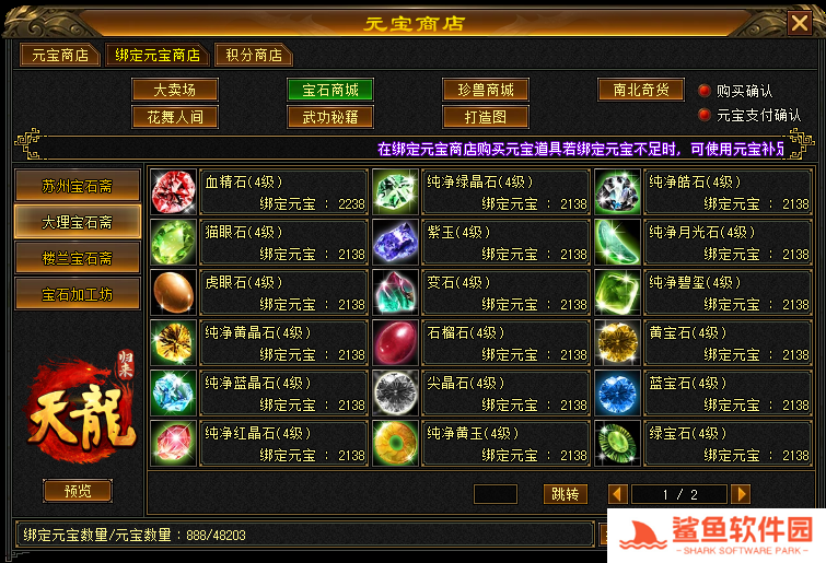绑元也能买宝石!价格优惠,童叟无欺!还有门派技能书、打造图、金蚕丝等道具同时上架,买不了吃亏,买不了上当,各位大侠们走过路过,千万不要错过啦!