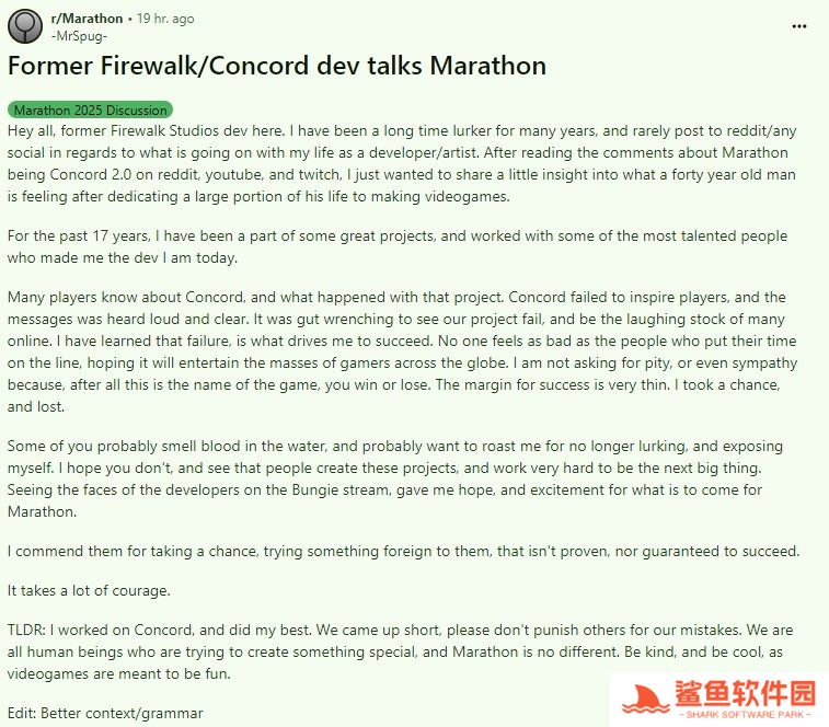 “我们做得不够好,但请不要拿我们的错误来惩罚别人。我们都是人,都在努力创造一些特别东西,《马拉松》也不例外。请保持友善,保持冷静,因为电子游戏的初衷就是为了好玩。那些在《马拉松》发布前就将其称为失败之作的人,实在太疯狂了!”