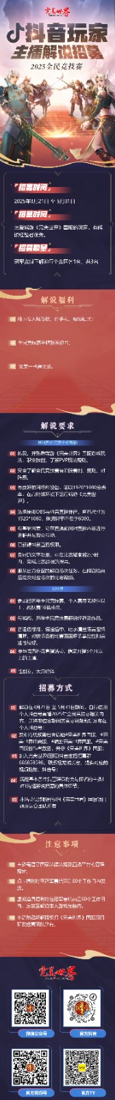 全民竞技赛主题“抖音创作者激励计划”活动和“抖音玩家主播解说招募”活动正在火热进行中。在参与赛事或观战比赛的过程中,在抖音平台直播精彩赛事,或录制比赛中的高光时刻,如精彩操作、极限反杀、默契配合等,通过精华片段剪辑,在抖音分享比赛的精彩瞬间。也可以分享与《完美世界》国服2025全民竞技赛相关的其他应援内容,参与短视频激励活动,轻松赢取丰厚奖金。