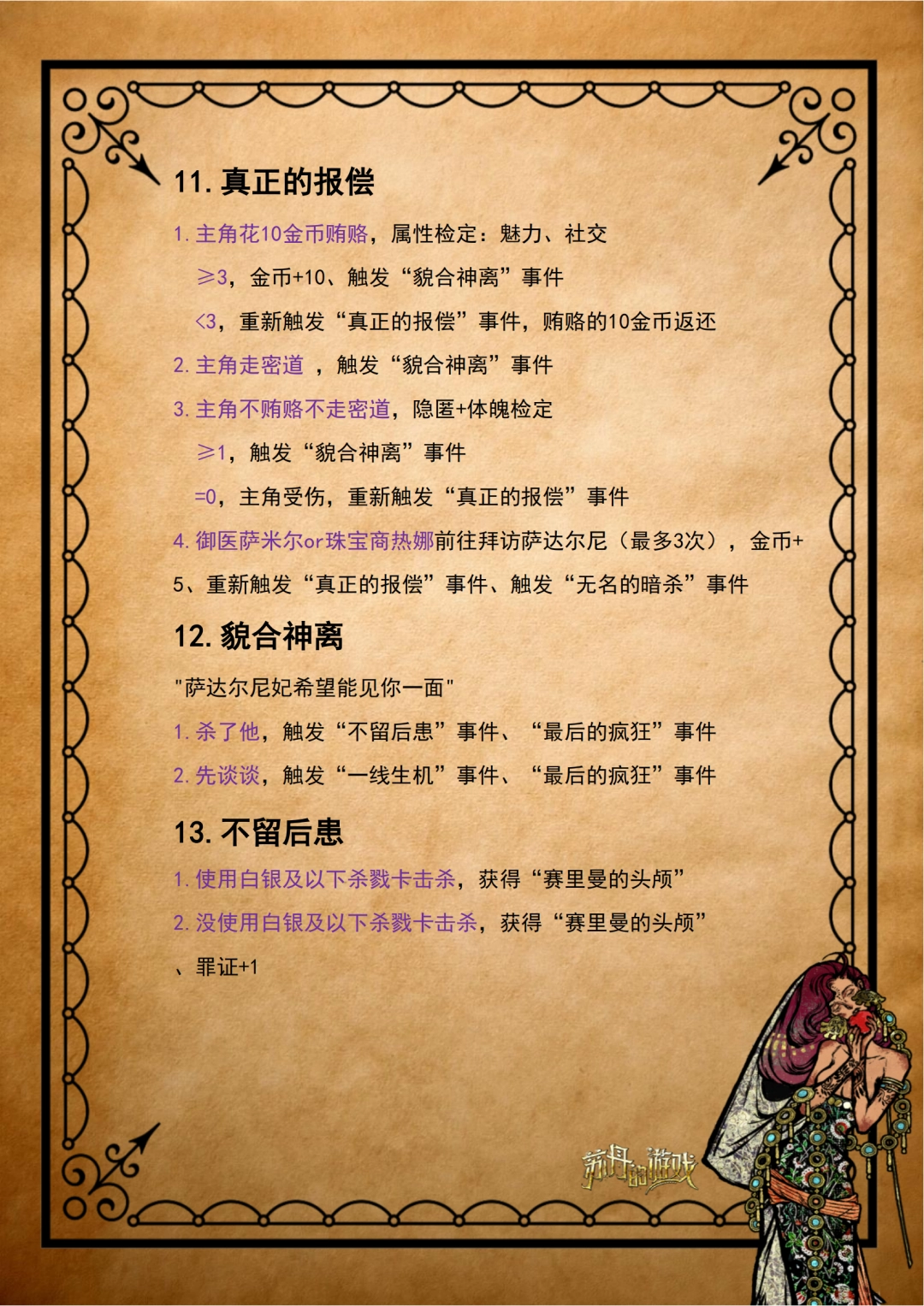 额外补充:这对小情侣剧情线很简单,但是他俩是真爱搞刺杀啊。“保守秘密”和“真正的报偿”都可以先溜一下拿点金币,但是不建议,收益不大,而且刺杀强锁主角。若有遗漏或其他解法,欢迎在评论区补充交流~