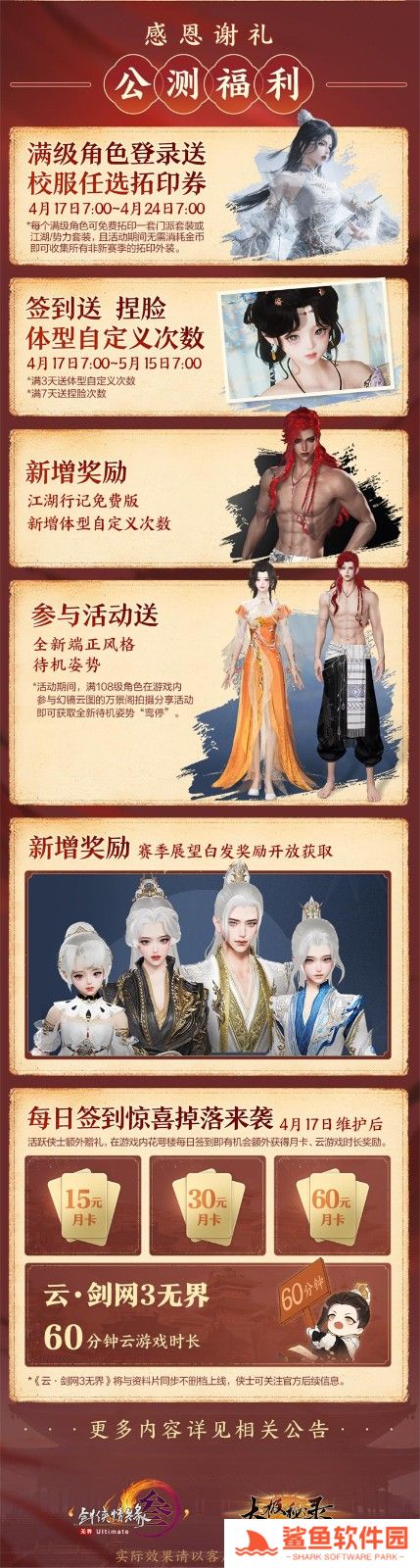 新赛季诸多丰厚的公测福利等你来拿!登录即领校服任选拓印券,幻镜云图的万景阁拍摄分享活动送待机姿势奖励,江湖行记免费版新增体型自定义次数好礼,新赛季快乐焕新貌,让各位侠士以自己喜欢的样子游历大美江湖!