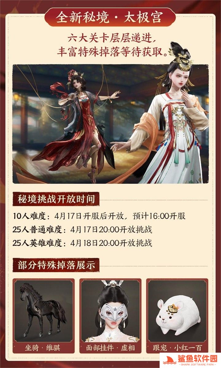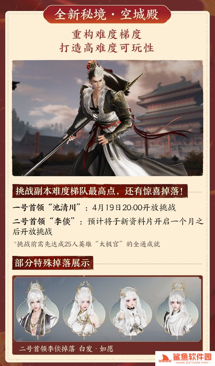 全新团队秘境“太极宫”是本次新资料片剧情进程中的高潮部分。在首领难度设计上,我们尽量兼顾不同层次的PVE侠士需求。“太极宫”中将有部分首领方便提升团挑战练习,保证大众PVE玩家的成长空间,而剩余首领难度会逐步攀升。25人挑战难度的“空城殿”秘境将作为新赛季中重建的副本难度梯队的最高点,保证秘境生态长线发展!