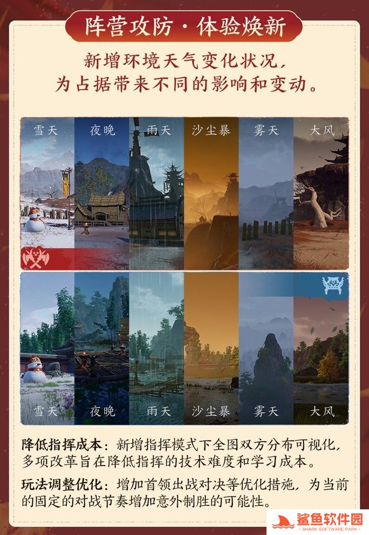 阵营攻防战作为《剑网3》的PVP体系核心特色之一,在本次资料片中,我们将聚焦【降低指挥成本】和【改善玩法体验】两大方面,新增全图双方分布可视化、攻防地图内的区域人数显示、环境天气变化状况等等,率先开启一系列的改动,开启重燃PVP激情这一循序渐进的过程。
