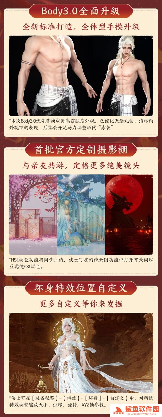 环身特效称号位置自定义和全新标准打造的body3.0素体正式上线,为人物的露肤部分,主要是肩臂手打造更细腻的肌理和流畅的线条。它与体型自定义系统兼容,因此不会影响角色的外轮廓,侠士已捏的体型均能同步生效。 与此同时,我们也关注到侠士们对于摄影棚的需求痛点。首批官方定制摄影棚现已登场,不受服务器限制,可以自由传送进入。幻镜云图新增的HSL滤镜功能将进一步满足更多的截图和创作需要,创造出更大的发挥空间!