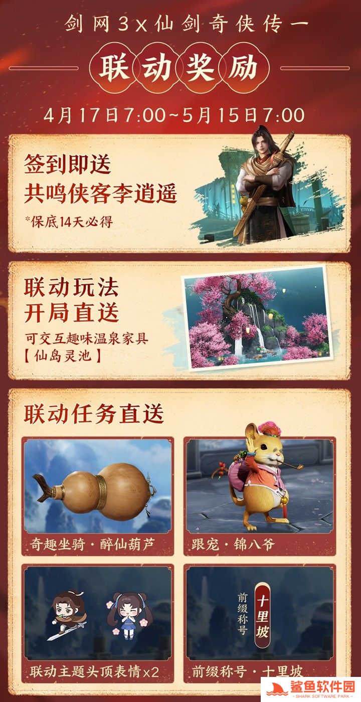 江湖茫茫,似乎始终萦绕着宿命的氤氲迷雾。这一次,李逍遥和赵灵儿将会来到《剑网3》的江湖,给侠士们带来更多的惊喜!全新《剑网3》×《仙剑奇侠传一》联动主题福利活动今日开启,签到即送共鸣侠客“李逍遥”,还有体型自定义次数和捏脸次数不容错过!