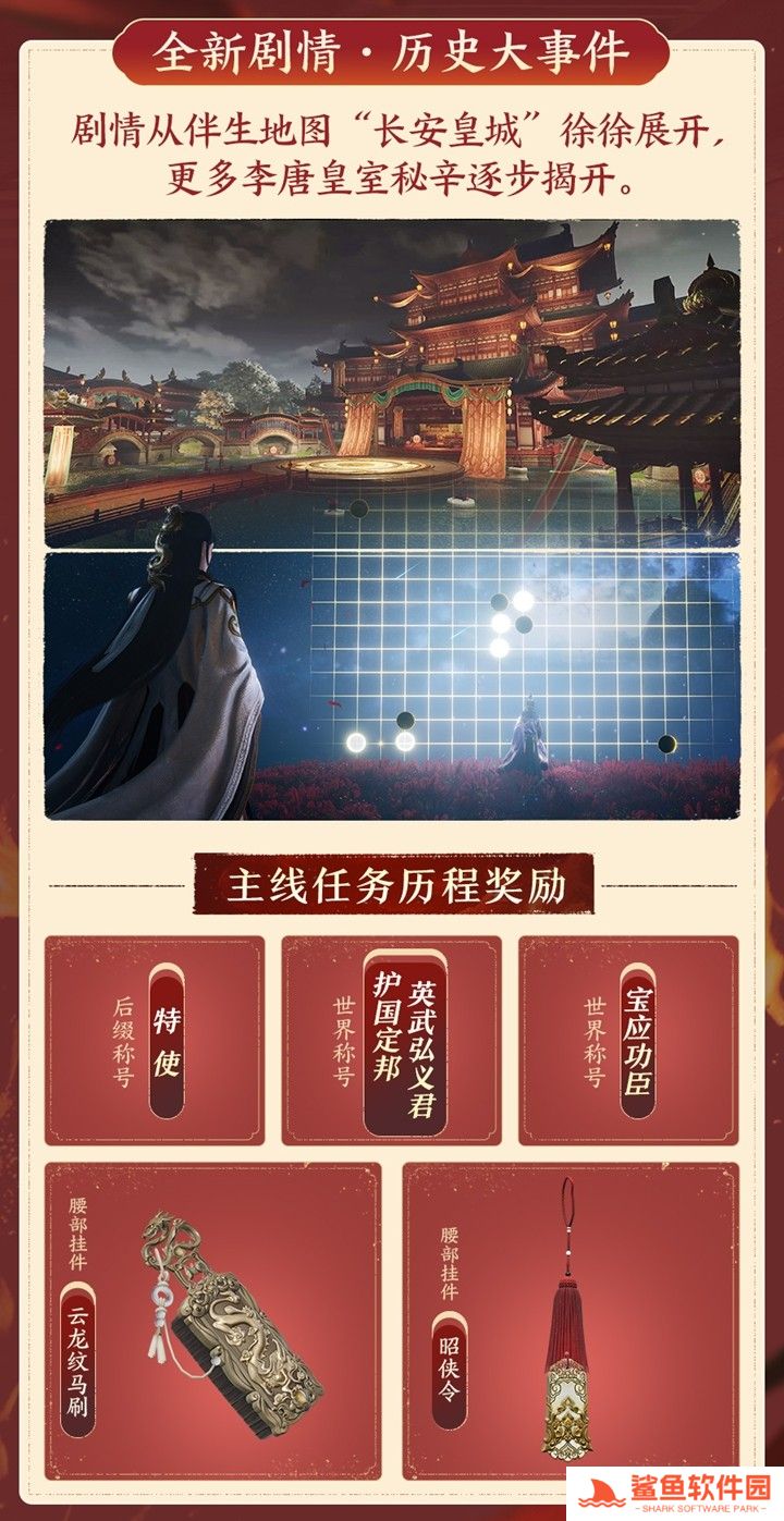 承接一之窟的剧情历程,侠士因运送财宝有功,获得东宫重用。此番卷入皇城**当中,侠士将踏入全新团队秘境“太极宫”以及伴生地图“长安皇城”,逐步揭开李唐皇室更多秘辛!