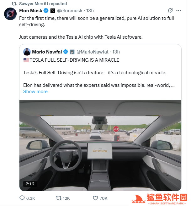 4月14日,马斯克在X上转发了Mario Nawfal的“特斯拉汽车全自动驾驶不是一样技术,而是一个奇迹”主题动态,并表示“很快就会有一个通用的、彻底的人工智能解决方案来实现完全的自动驾驶,只需摄像头