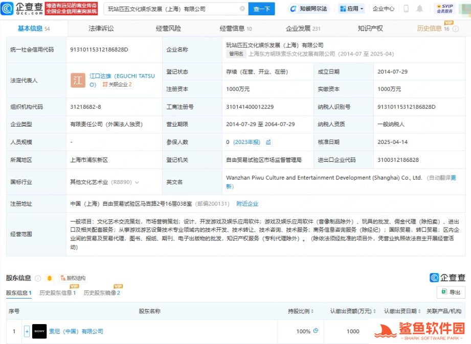 日前据企查查APP显示,原合资公司上海东方明珠索乐文化发展有限公司发生工商变更,公司更名为玩站匹五文化娱乐发展(上海)有限公司,原股东上海东方明珠文化发展有限公司退出,现由索尼(中国)有限公司全资持股。