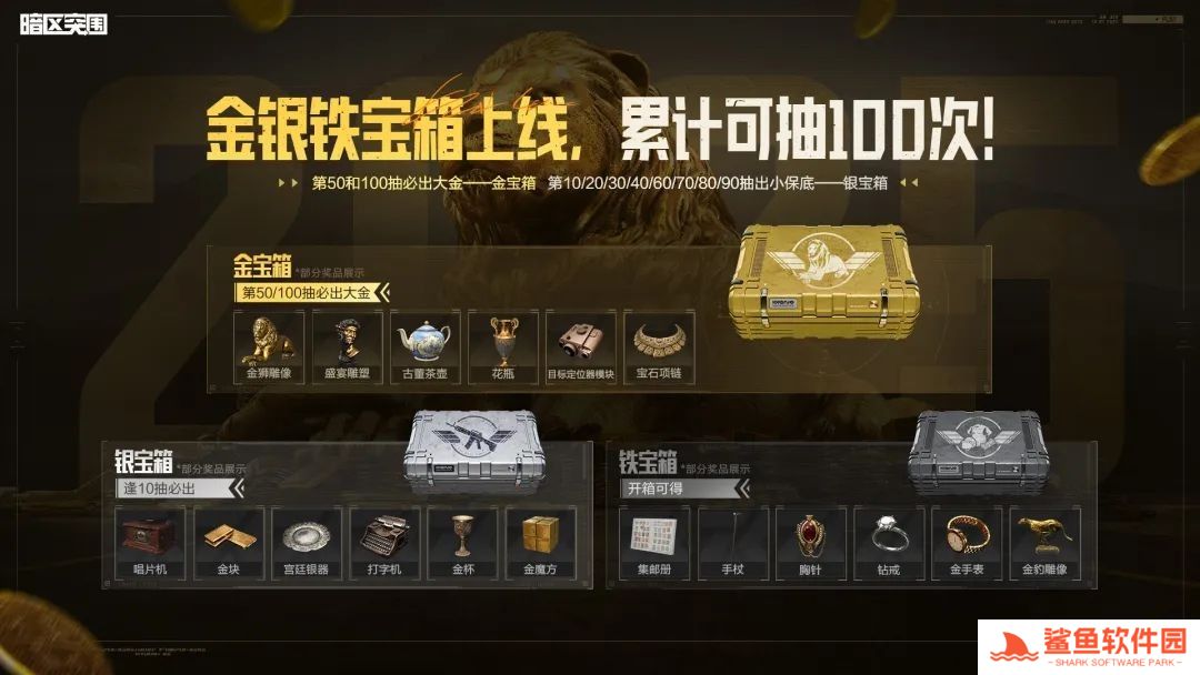 【看直播开宝箱】第五期上线!参与活动必得双大金!第50和100抽必出大金--金宝箱,逢10抽出小保底-银宝箱!前往指定暗区主播直播间互动即可有机会获取宝箱钥匙,三色宝箱奖励拿到手软!完成每周任务,下周登录即可领取4格安全箱体验卡(3天体验卡,领取后28天内有效)。