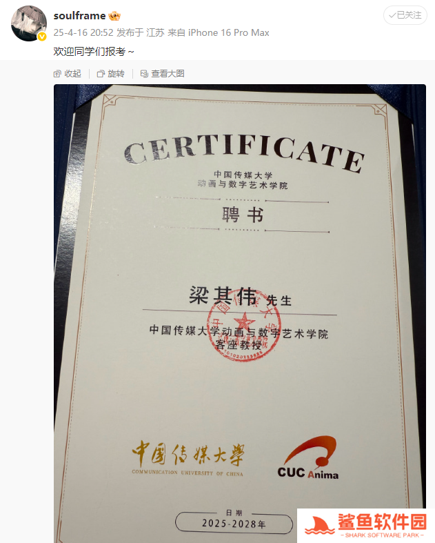 近日《影之刃零》制作人梁其伟在微博上发文,称已受聘为中国传媒大学动画与数字艺术学院客座教授,并展示了相关聘书。