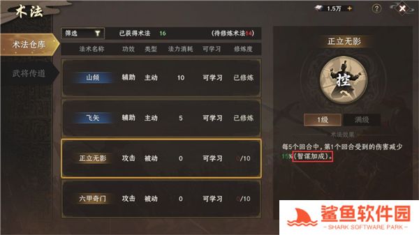 “正立无影”可为队伍提供受到谋略加成的首回合减伤效果,适合搭配谋略属性较高的武将来使用。