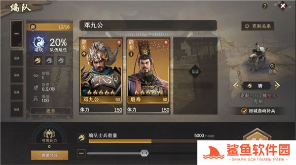 队伍适性:每位武将都有着不同的兵种适性,为武将选择合适的兵种将获得额外的兵种基础属性值提升,编队内每位武将可为适性符合的兵种提高20%的基础属性加成,最高可通过武将搭配提升60%的兵种基础属性值。