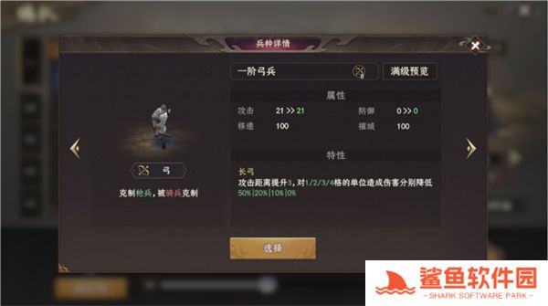 除器械外的骑兵、枪兵、弓兵、刀盾还具有自身特性。其中弓兵会额外提升三格的攻击距离但会对靠近单位伤害衰减。
