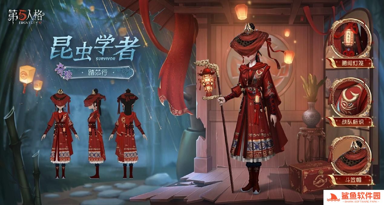 为成都GG战队求生者方精心打造的【奇珍时装】昆虫学者-踏莎行,红色流苏自箬笠上垂落,轻纱下的面容若隐若现,战队LOGO融进了衣襟上的刺绣中,随着她穿行在闹市的人流间。交领襦裙利落大方,衣摆刺着灵动的蜀绣纹样,护腕缠绕着红色绳结,腰间配着精巧的灯笼与短剑,灯火与江湖都是她前行的方向。