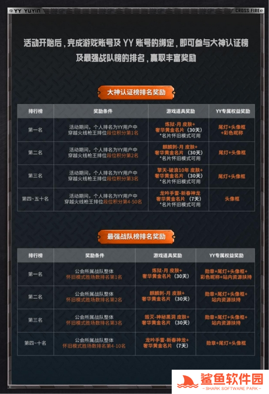 除了丰富的用户福利活动,YY 语音还携手穿越火线为高级别玩家策划了专属福利活动,2025年4月起,双方将面向所有绑定YY语音和游戏账号的用户,推出“大神认证排行榜”及“最强公会排行榜”月榜活动,一旦上榜将获得限定版游戏皮肤+名片奖励,及诸多YY语音专属权益奖励,彰显身份的尊贵。值得一提的是,这是穿越火线首次推出战队排行类活动,谁能拿下首次奖励,将载入游戏史册。