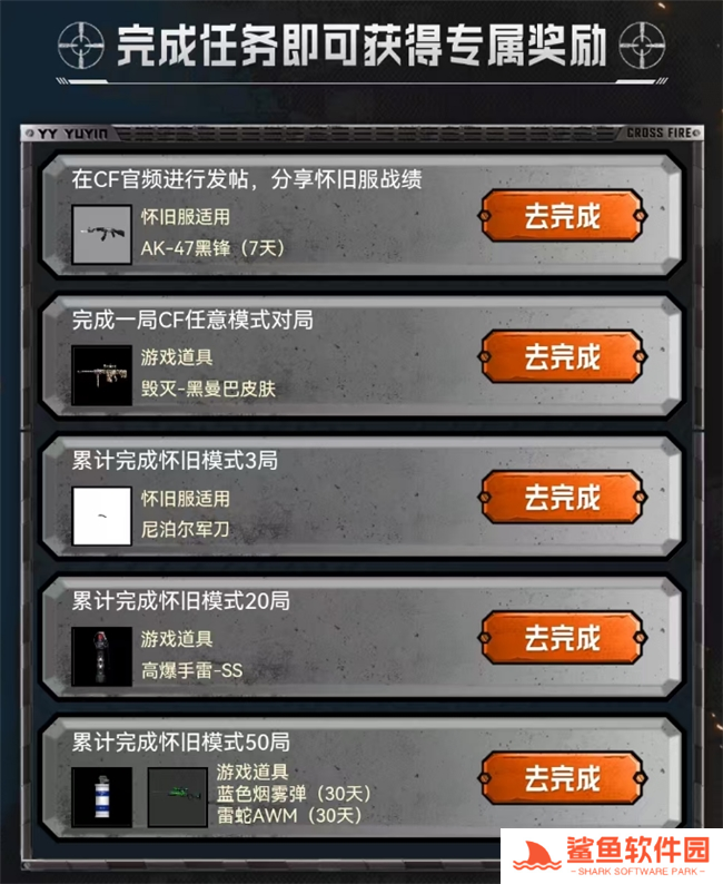 此外,活动期间完成YY账号绑定的穿越火线用户,在游戏内完成任务还将获得诸多怀旧模式专属道具,以上所有道具奖励数量有限,先到先得!